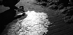 The result is a frozen puddle which, with its silver shining surface appears to be equally strange and fascinatingly alien, particularly in these surroundings. The sculpture looks like a lake without banks – or like the surface of a landscape with a unique profile, containing gentle undulations, depressions and grand drops of the material. Its beauty lies in the self-sought expansion, its light effect and in all that which disturbs the impression of an all-too perfect smoothness.